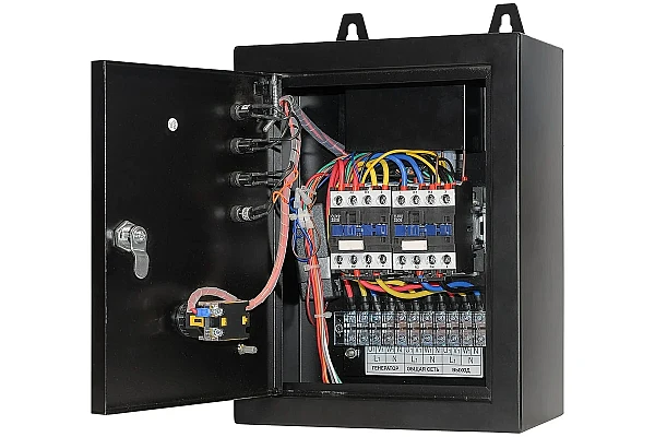 Главным преимуществом блока управления АВР-С TSS 9000D/230/400 является универсальность – устройство можно применять как в однофазных, так и трехфазных системах резервирования питания; оно также подходит для совместной работы с электростанциями с переключаемой мощностью. В качестве силового коммутационного узла блок оборудован двумя 4-линейными электромагнитными контакторами CJX2, рассчитанными на 25-амперную нагрузку. Для управления работой системы автозапуска служит встроенный цифровой контроллер.