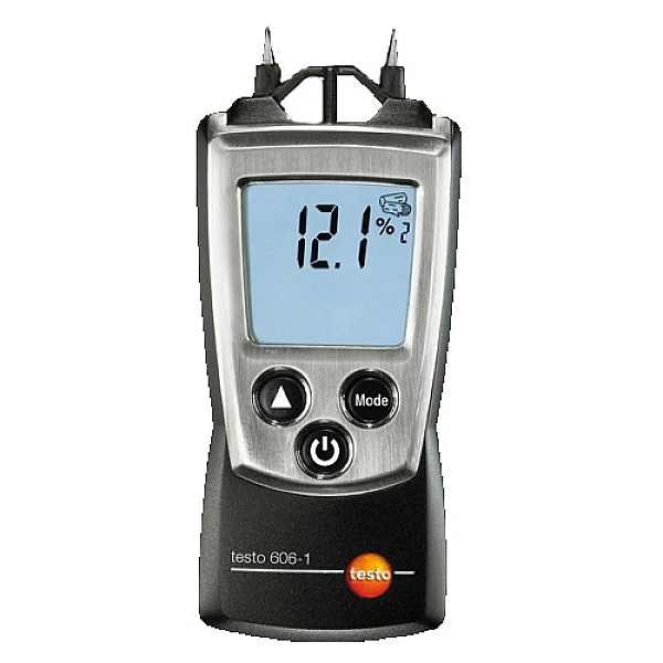 Цифровой гигрометр Testo 606-1 определяет показатели влажности объектов контроля путем измерения их сопротивления контактным способом, с помощью игольчатых электродов, исходя из характеристических зависимостей, определенных для конкретных видов материалов. Результаты измерения влажности отображаются в процентном отношении к весу материала, при этом на дисплее также высвечивается тип материала (пиктограмма и номер из списка, наклейка с которым размещена в защитной крышке). В зависимости от диапазона влагосодержания материалы объединены в 7 групп.