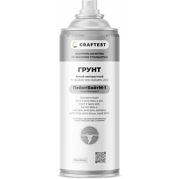 Грунт ПэйнтВайтМ-1 белый контрастный без ацетона представляет собой специальный белый контрастный краситель для магнитопорошкового контроля на основе растворителя, не содержащего в своем составе ацетон. Предназначена для создания тонкого слоя контрастного фона на поверхности контроля для четкой различимости в обычном освещении черных частиц магнитных суспензий КРАФТЕСТ МагБлэкО-1 и КРАФТЕСТ МагБлэкО-2. Для удаления может быть использован очиститель КРАФТЕСТ КлинКар-1.