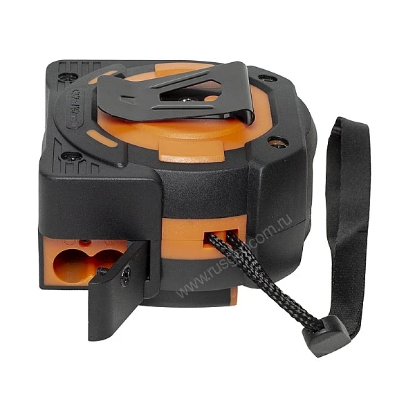 Наконечник ленты оснащен скобой, которая позволяет закрепить начало ленты на выступе. Крепление зацепного крюка к ленте имеет свободный ход, равный толщине зацепа, что удобно, когда вы вы делаете замер, зацепив крюк за какой-либо объект. Благодаря этому, зацеп смещается на свою толщину и край предмета совпадает с нулевой отметкой. Магнитные держатели обеспечат надежное крепление скобы рулетки RGK RD-40 к металлическим предметам и поверхностям, что удобно при измерении больших расстояний без помощника.
