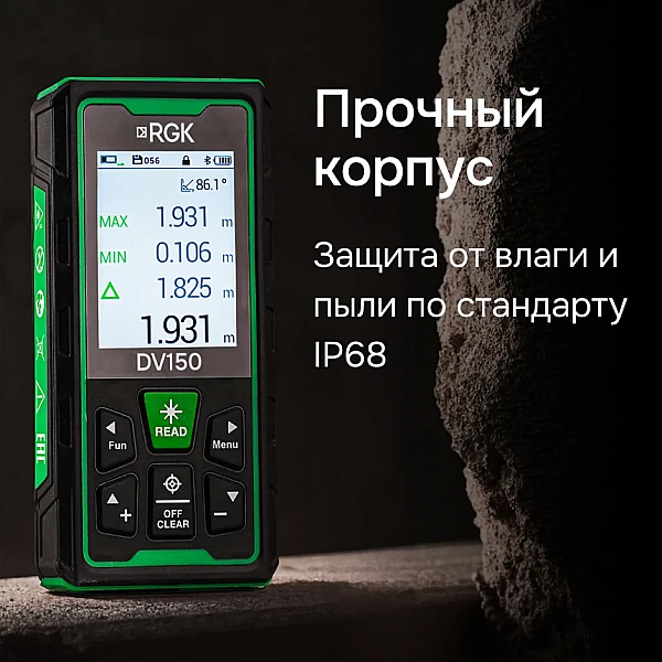 Дальномер RGK DV150 оснащен мощным лазером, который позволяет измерять расстояния на удалении до 150 метров с двухмиллиметровой точностью, что позволяет работать не только в помещениях, но и на улице. Отличительной особенностью дальномера RGK DV150 является наличие яркого лазерного маркера, облегчающего наведение на цель.