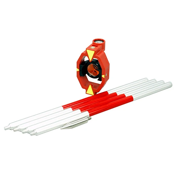 В комплекте поставляется разборная металлическая веха, которая позволяет изменять высоту размещения минипризмы вплоть до 1.3 м. В собранном состоянии конструкция из 4 резьбовых секций надежна и стабильна, элементы вехи качественно окрашены и не подвержены коррозии. Заостренный металлический наконечник обеспечивает надежную установку на рыхлых поверхностях, таких как грунт или песок. Также имеется специальный крючок, при помощи которого можно подвесить отражатель в необходимом положении.